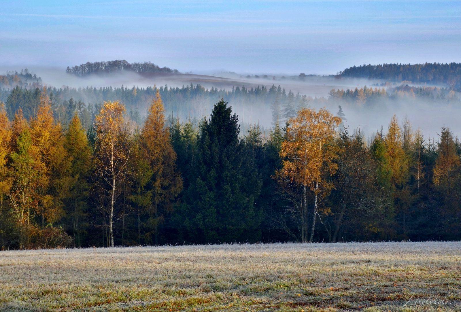 Ne. Nemyslím proměnu krajiny ve staletích ani desetiletích, dokonce ani den po dni. Já mám na mysli proměnu v několika minutách. Ano. Během velmi krátké doby se krajina zcela změní. Dnes ráno jsem to zažila znovu. Moje cesta z postele na louku trvá nanejvýš dvě minuty, a přesto jsem nestihla nafotit sluníčko. V ložnici z okna jsem ho viděla, ale když jsem doběhla na louku, bylo už schované v mlze. A za dalších pár minut nebylo vidět na krok. 🤦