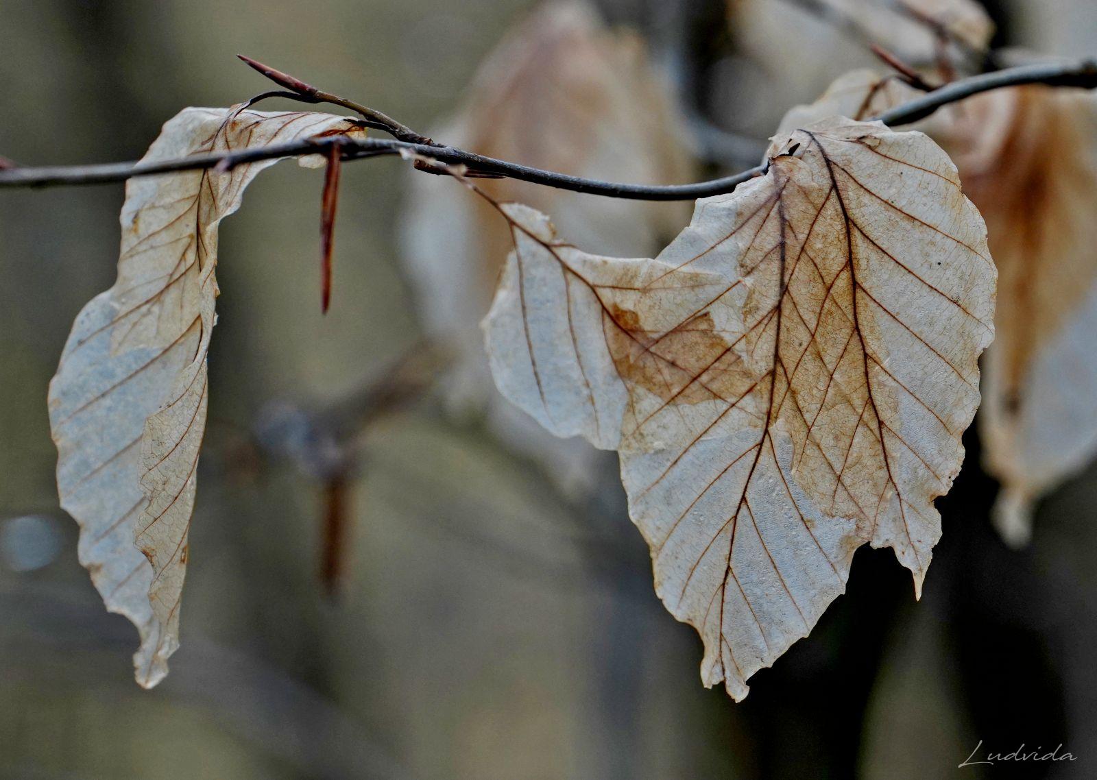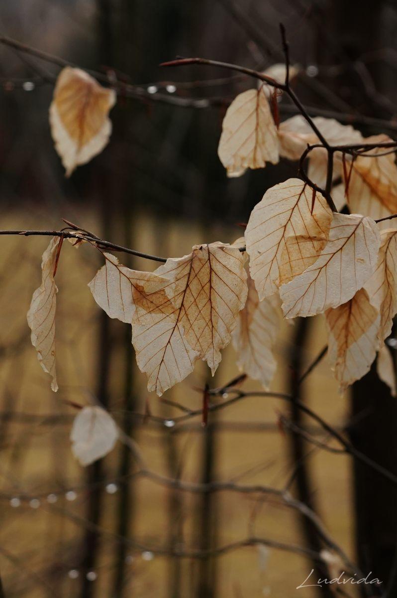 A pak jsem si všimla bukových listů (které drží po celou zimu na větvích). Na každém stromku totiž měly odlišné zabarvení. Čím víc jsem se o to zajímala, tím víc barev listů jsem nacházela. Prostě neuvěřitelná pestrá škála. Ty nejsvětlejší jsou béžovo-bílé. Mají nejjemnější strukturu a jsou téměř průhledné, a tak vyniká jejich výrazné kontrastní žilkování. Ty jsou nejblíže zkáze, protože se jim už rozpadly buněčné struktury pro nedostatek barviv. A po nich najdete listy všech odstínů oranžové, kterou mají “na svědomí” karotenoidy. Ty v listech zůstávají, když se z nich na podzim ztratí chlorofyl. Hnědé tóny různé sytosti způsobují třísloviny. Barvy se utvářejí podle toho, jakým vlivům počasí je list vystaven. Záleží na tom, ve kterém místě strom roste, na větru nebo uvnitř v lese, jestli je osamocen nebo ve skupině, také záleží na tom, kde listy rostou, jestli u země nebo v koruně stromu atd. atd. A já si toho do současnosti nevšimla! Ale ano, listy buku jsou fascinující a mám desítky fotografií ze všech ročních období, ale to uvědomění si barevnosti přišlo až teď. Díky za to.