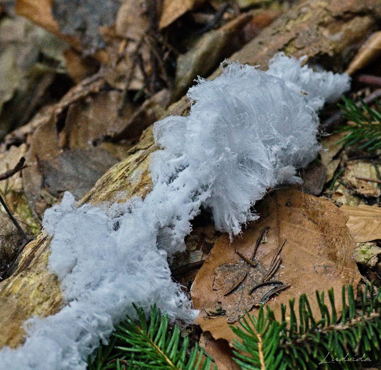 Děje se to tak. Když venku mírně mrzne a ve dřevě je ještě voda, začne se vytlačovat kapilárními otvory cca 0,1 mm na povrch, kde okamžitě mrzne. Pokud by ve dřevě nebyla na správná houba, voda by vytekla a spojila se, ale nějaká látka z ní způsobí, že se jednotlivá ledová vlákna nespojí a “rostou” třeba až do délky několika centimetrů. Tyto vlasy v lese září svojí bělostí, a tak je snadné si jich všimnout. Prostě veliká krása, která byla popsána až v roce 2015.