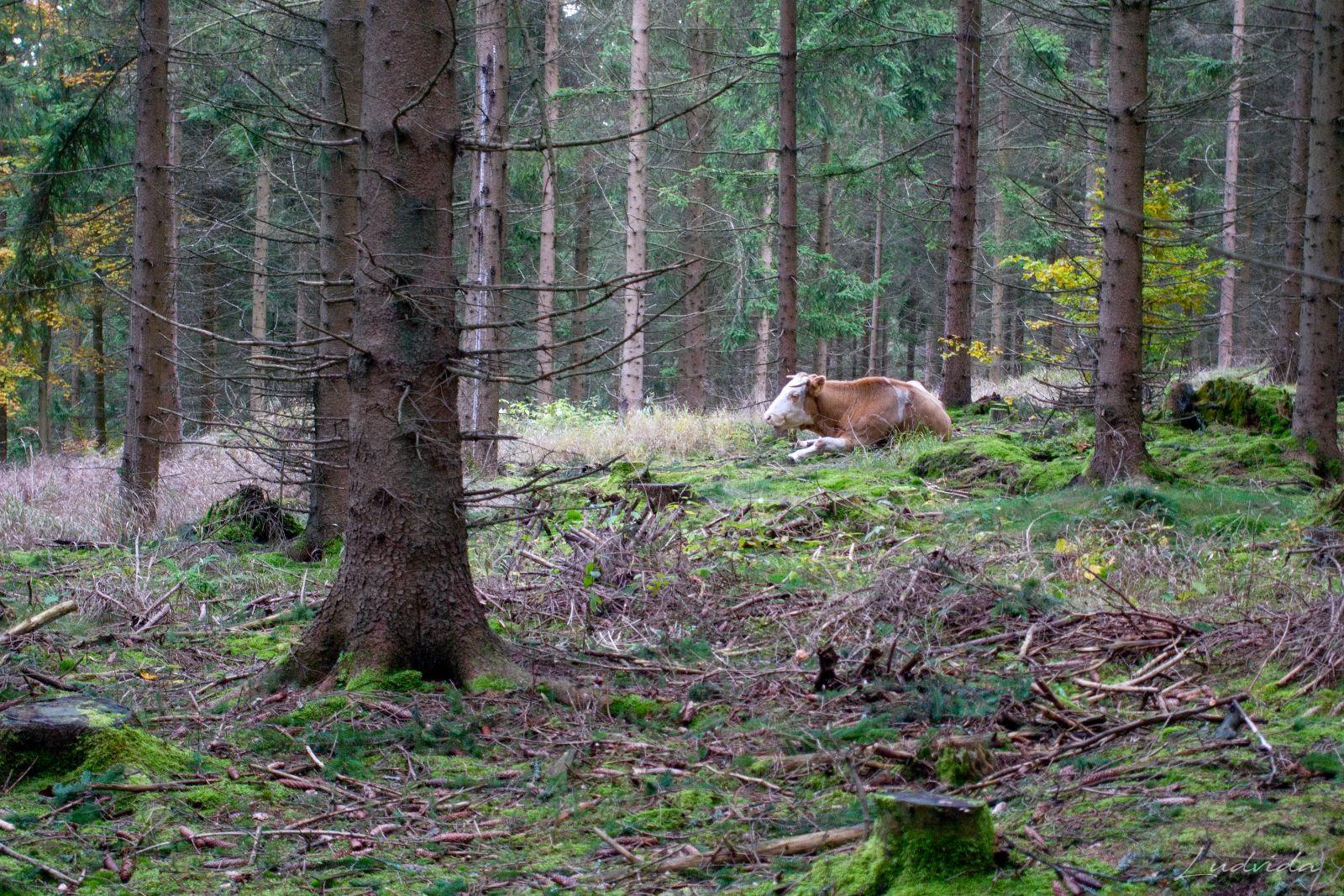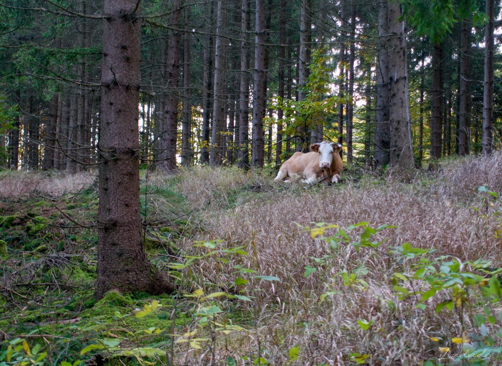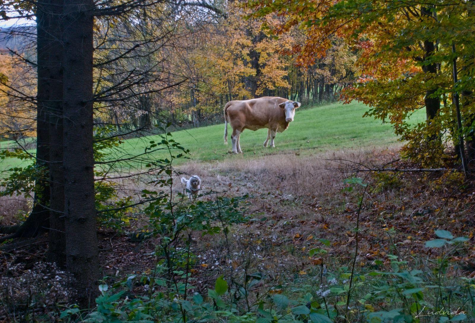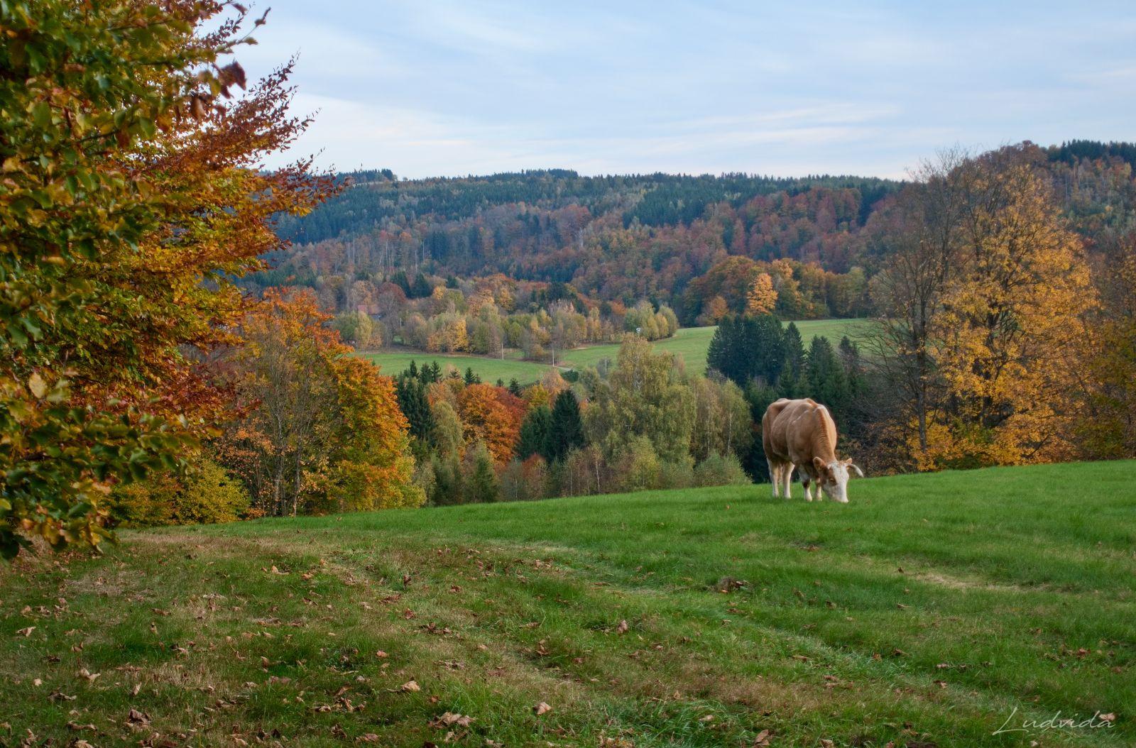 Asi za půl hodiny jsem se vracela. Jenže kráva už v lese nebyla. Pak mne napadlo vyjít z lesa na louku. Pásla se kousek ode mne. Opět jsem pořídila nádherné záběry krávy v podzimních dekoracích. A hlavně jsem měla velkou radost, že není zraněná (a že jsem se vrátila pro ten foťák).