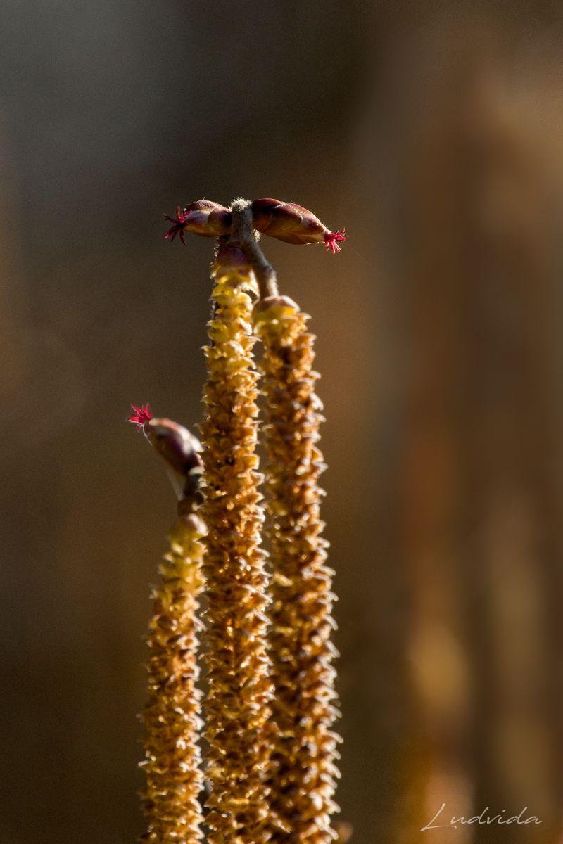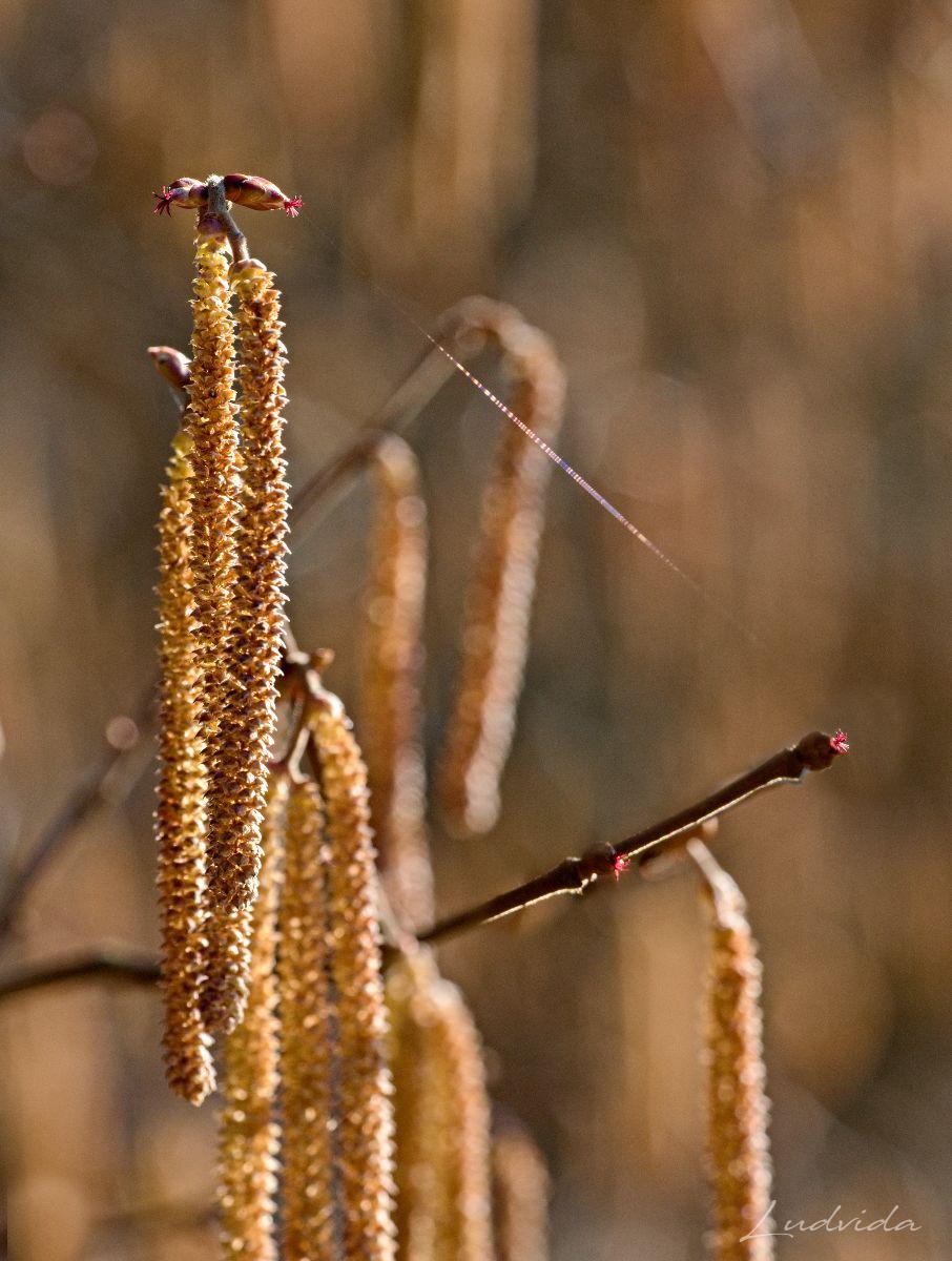 Letos jsem dala do kalendáře fotografii právě rozkvetlé lísky (z 22. března) s nádhernými jehnědami a krásnými jasně červenými “štětečky”. Vlastně ty blizny samičích květů byly hlavním objektem fotografie. Čekám na ně každé jaro a fotografuji je mnoho let, je ale snadné je na keři přehlédnout, protože jsou velké pouhé dva milimetry. Jako děti jsme klepaly větvemi, uvolňovaly “mračna” pylu, opylovaly “štětečky” a věřily že právě díky nám bude bohatá úroda oříšků. A tak jsem fotografii se štětečky dala do kalendáře a předpokládala, že každý se s tou fotografií vrátí do dětství…