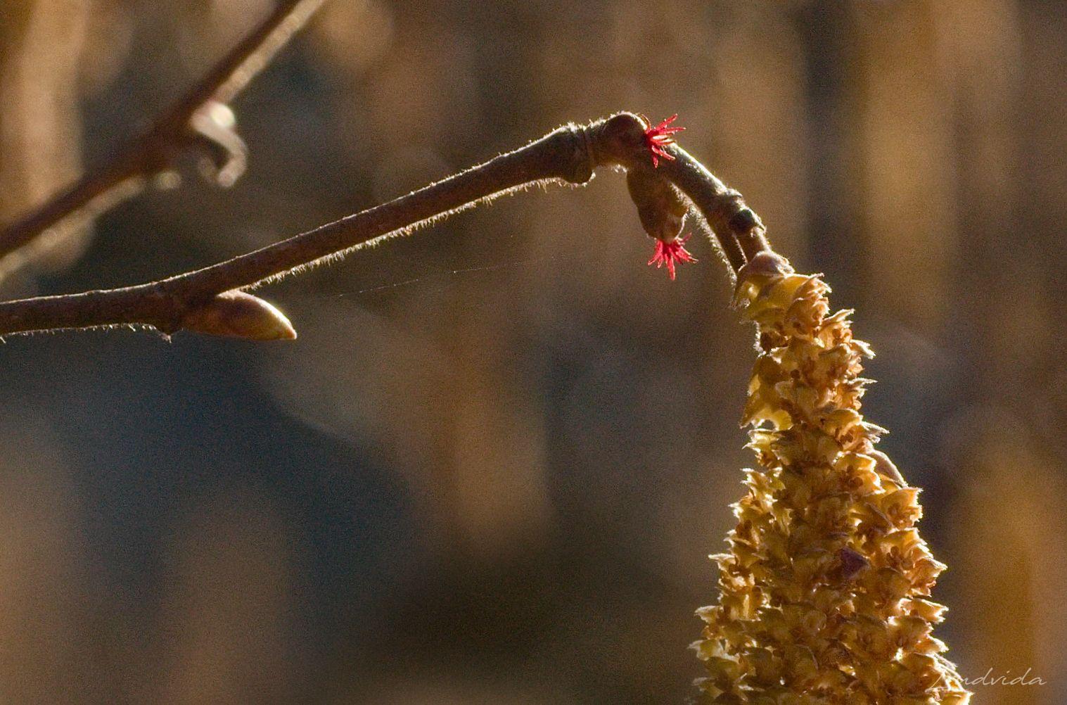 JENŽE, nikdo nevěděl, co na fotografii je. Vzhledem k tomu, že zítra více než sto lidí najde pod stromečkem kalendář, musím to zde objasnit. V kalendáři na straně měsíce března je fotografie, na které jsou na větvičce malé červené “štětečky”, tedy blizny ze samičích květů lísky. Právě z nich po opylení budou lískové oříšky.