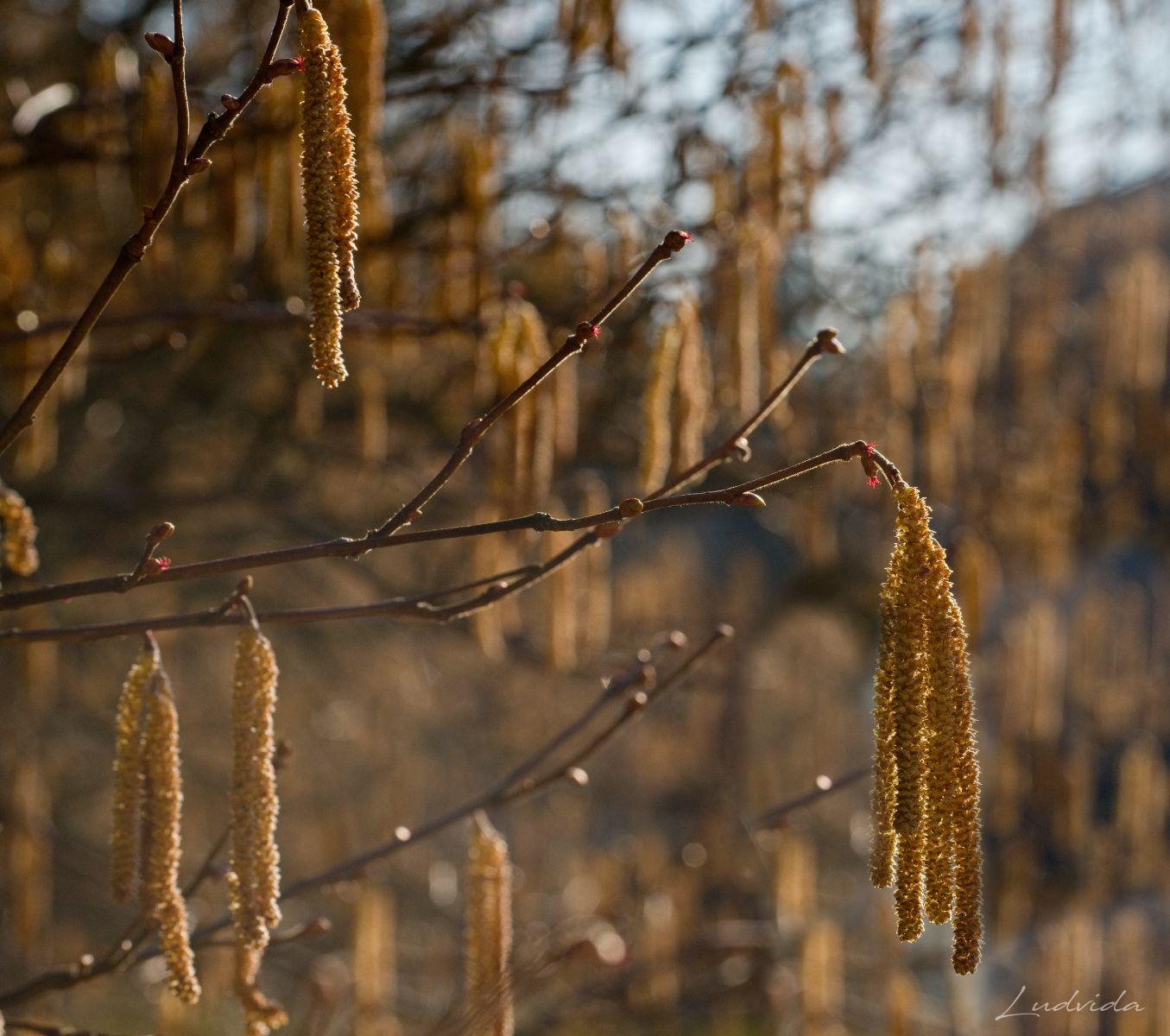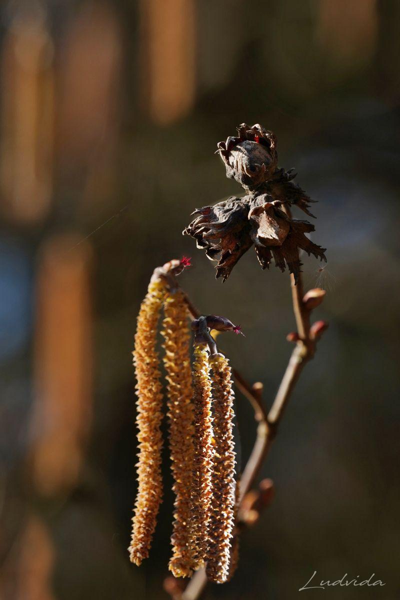 Letos jsem dala do kalendáře fotografii právě rozkvetlé lísky (z 22. března) s nádhernými jehnědami a krásnými jasně červenými “štětečky”. Vlastně ty blizny samičích květů byly hlavním objektem fotografie. Čekám na ně každé jaro a fotografuji je mnoho let, je ale snadné je na keři přehlédnout, protože jsou velké pouhé dva milimetry. Jako děti jsme klepaly větvemi, uvolňovaly “mračna” pylu, opylovaly “štětečky” a věřily že právě díky nám bude bohatá úroda oříšků. A tak jsem fotografii se štětečky dala do kalendáře a předpokládala, že každý se s tou fotografií vrátí do dětství…