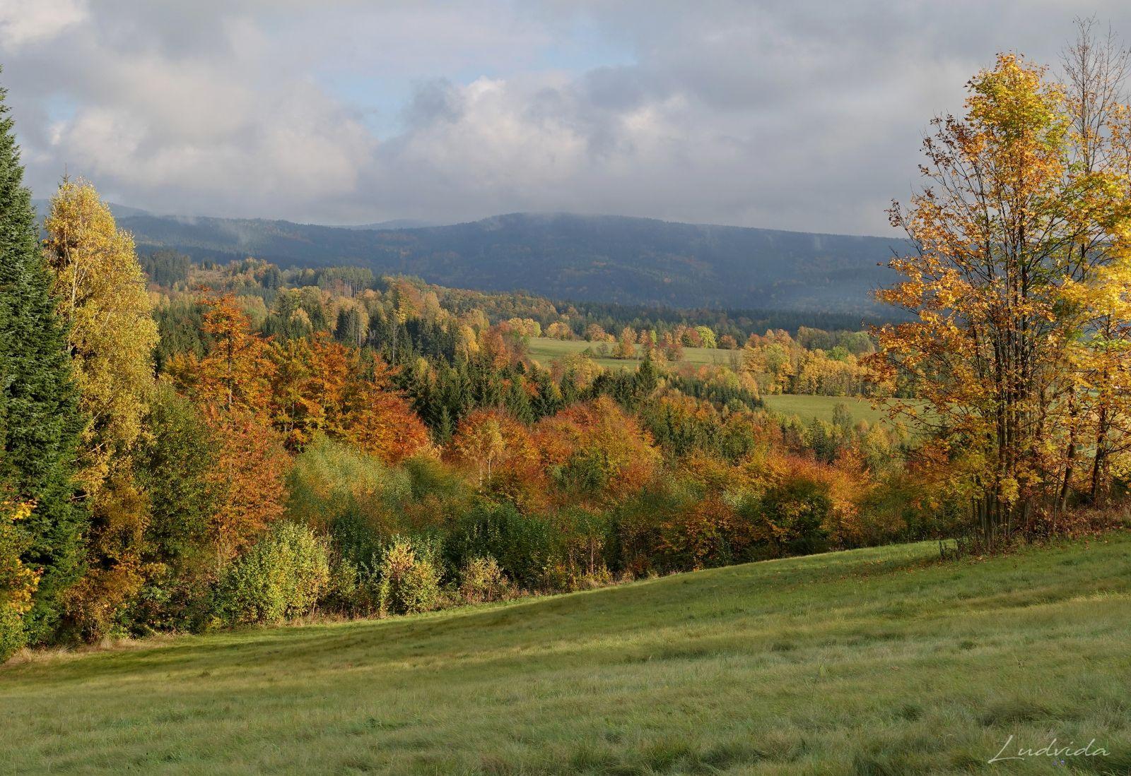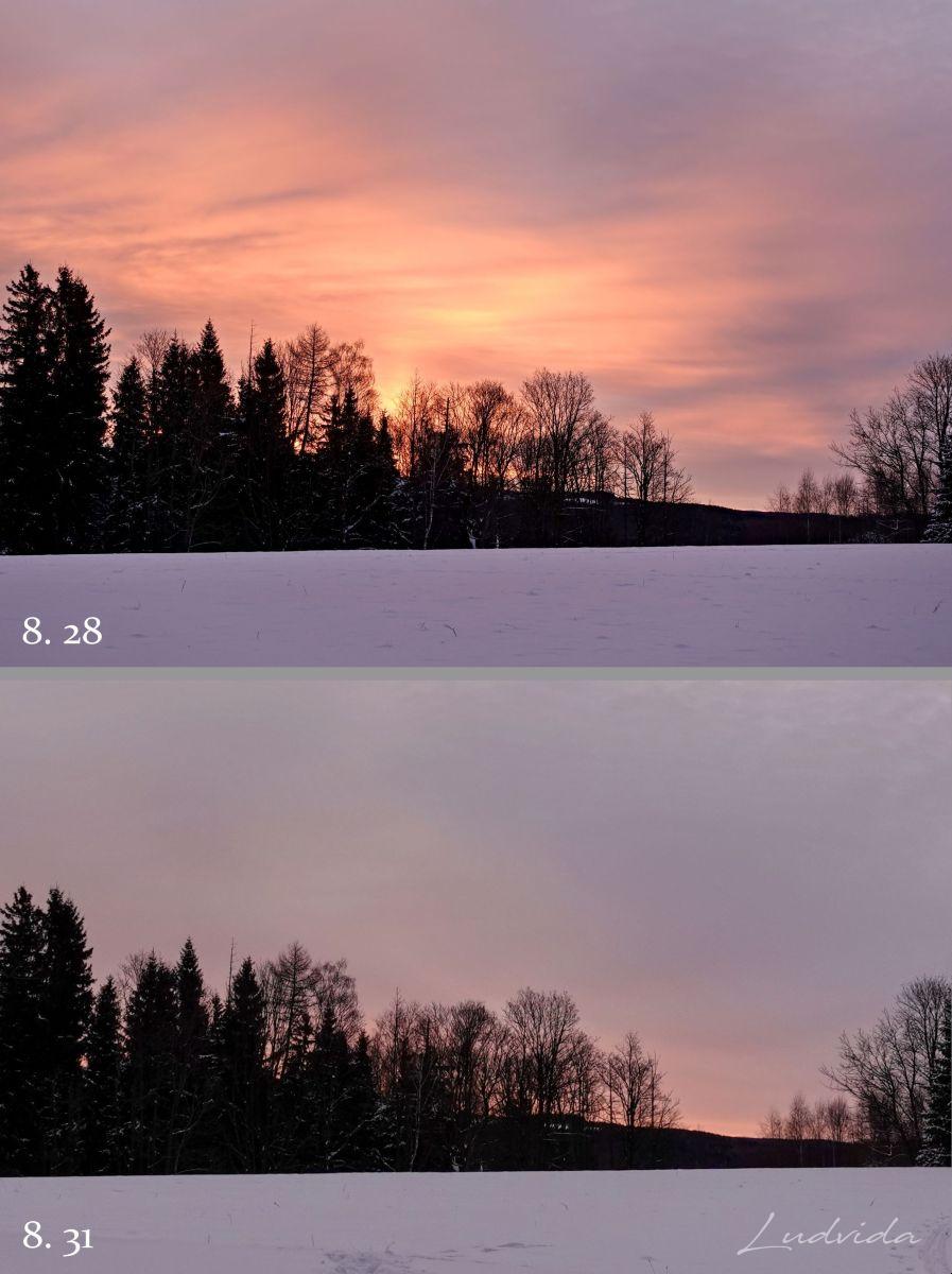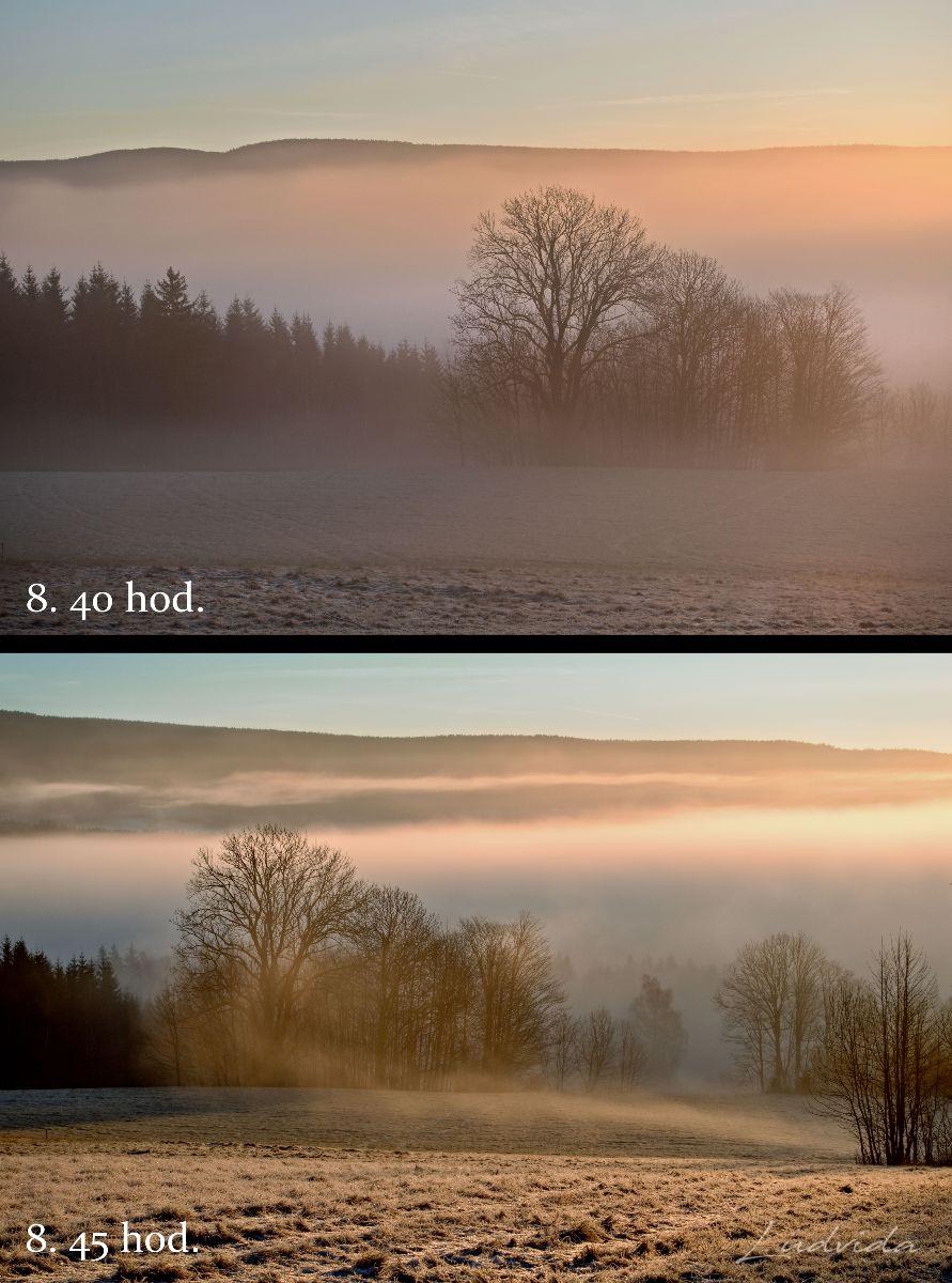 Ne. Nemyslím proměnu krajiny ve staletích ani desetiletích, dokonce ani den po dni. Já mám na mysli proměnu v několika minutách. Ano. Během velmi krátké doby se krajina zcela změní. Dnes ráno jsem to zažila znovu. Moje cesta z postele na louku trvá nanejvýš dvě minuty, a přesto jsem nestihla nafotit sluníčko. V ložnici z okna jsem ho viděla, ale když jsem doběhla na louku, bylo už schované v mlze. A za dalších pár minut nebylo vidět na krok. 🤦