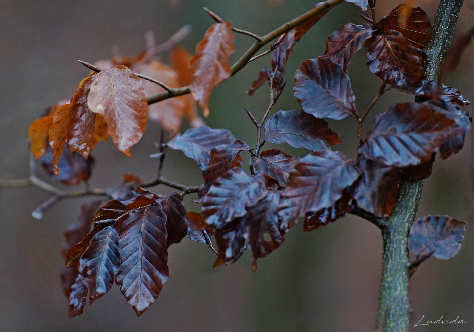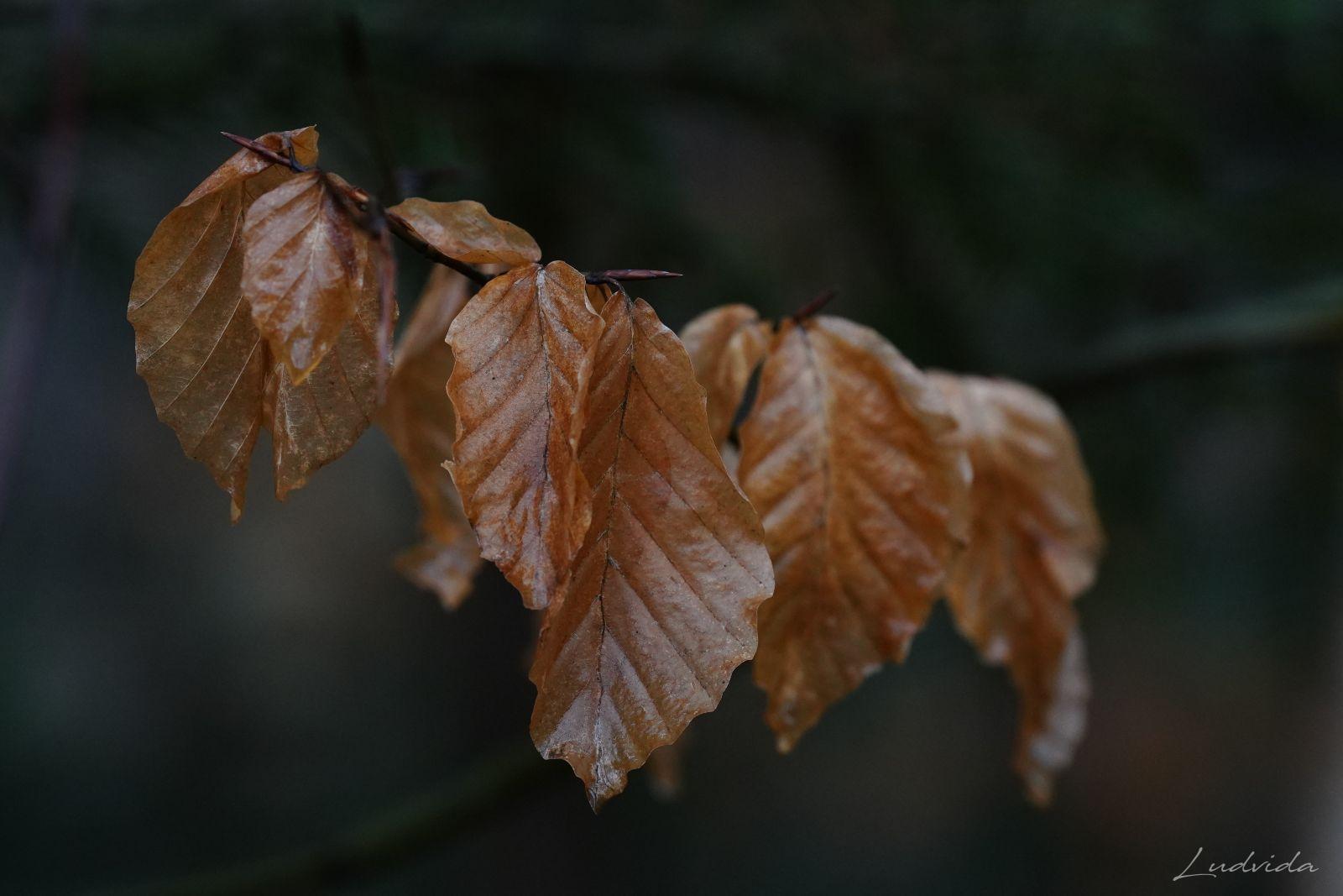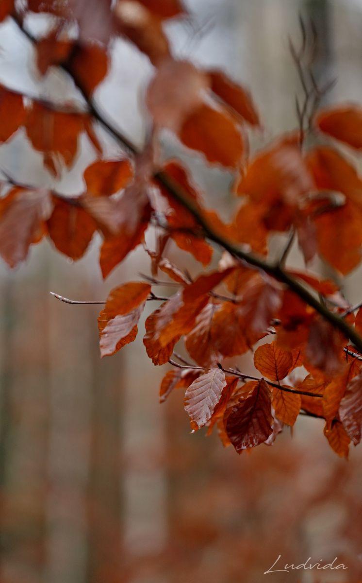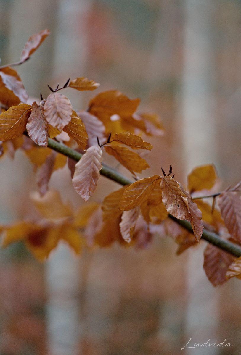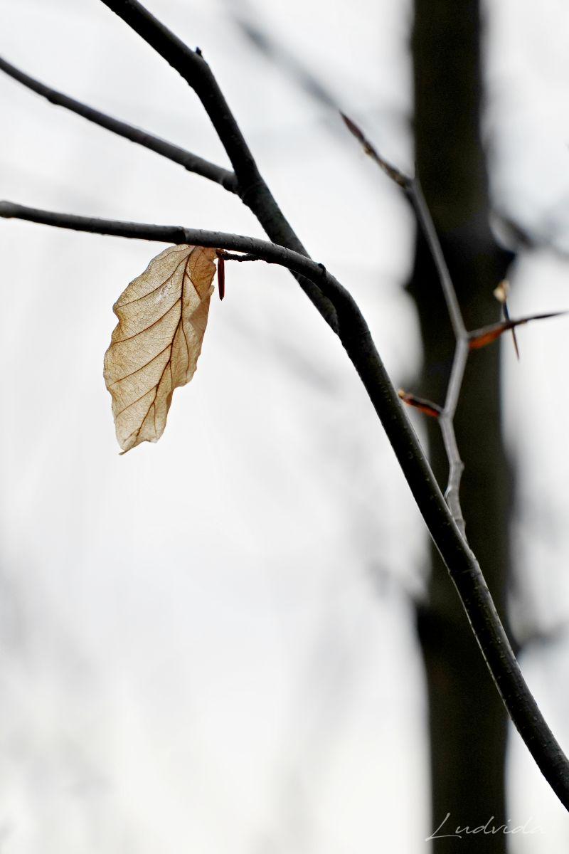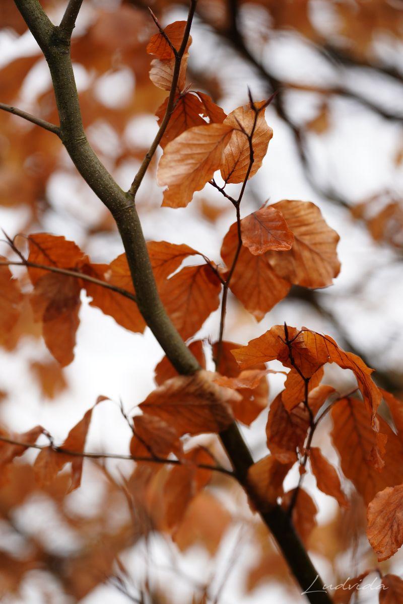 A pak jsem si všimla bukových listů (které drží po celou zimu na větvích). Na každém stromku totiž měly odlišné zabarvení. Čím víc jsem se o to zajímala, tím víc barev listů jsem nacházela. Prostě neuvěřitelná pestrá škála. Ty nejsvětlejší jsou béžovo-bílé. Mají nejjemnější strukturu a jsou téměř průhledné, a tak vyniká jejich výrazné kontrastní žilkování. Ty jsou nejblíže zkáze, protože se jim už rozpadly buněčné struktury pro nedostatek barviv. A po nich najdete listy všech odstínů oranžové, kterou mají “na svědomí” karotenoidy. Ty v listech zůstávají, když se z nich na podzim ztratí chlorofyl. Hnědé tóny různé sytosti způsobují třísloviny. Barvy se utvářejí podle toho, jakým vlivům počasí je list vystaven. Záleží na tom, ve kterém místě strom roste, na větru nebo uvnitř v lese, jestli je osamocen nebo ve skupině, také záleží na tom, kde listy rostou, jestli u země nebo v koruně stromu atd. atd. A já si toho do současnosti nevšimla! Ale ano, listy buku jsou fascinující a mám desítky fotografií ze všech ročních období, ale to uvědomění si barevnosti přišlo až teď. Díky za to.