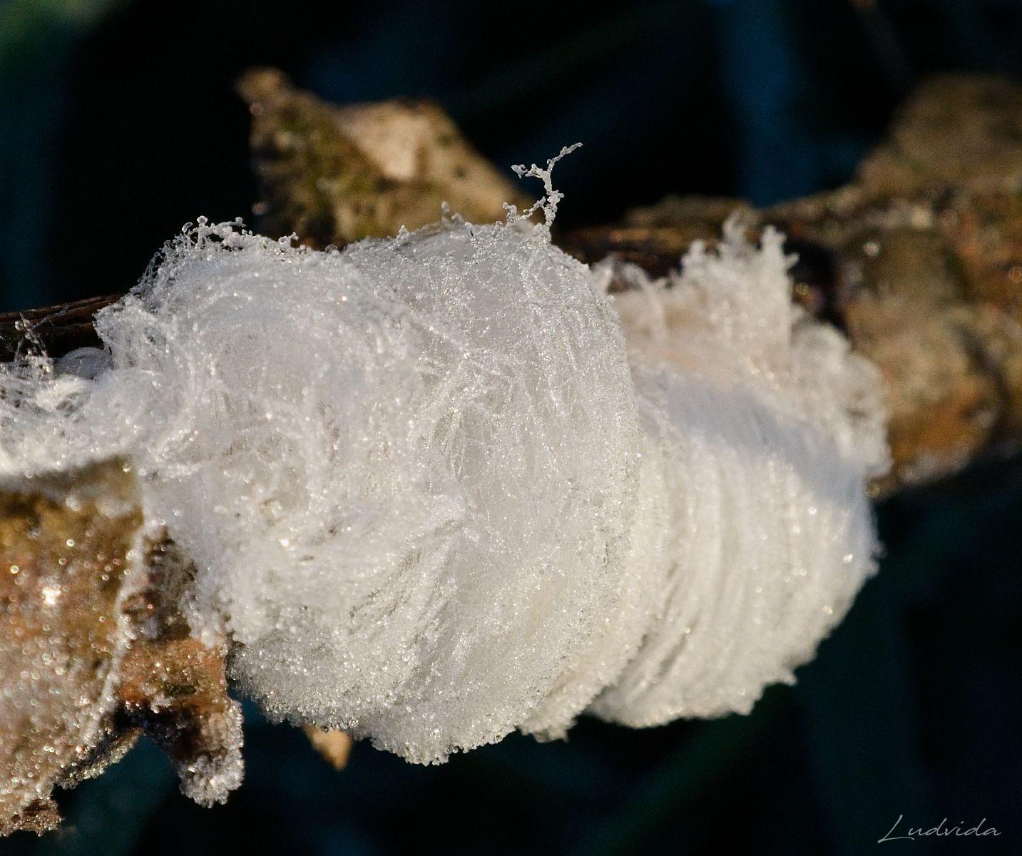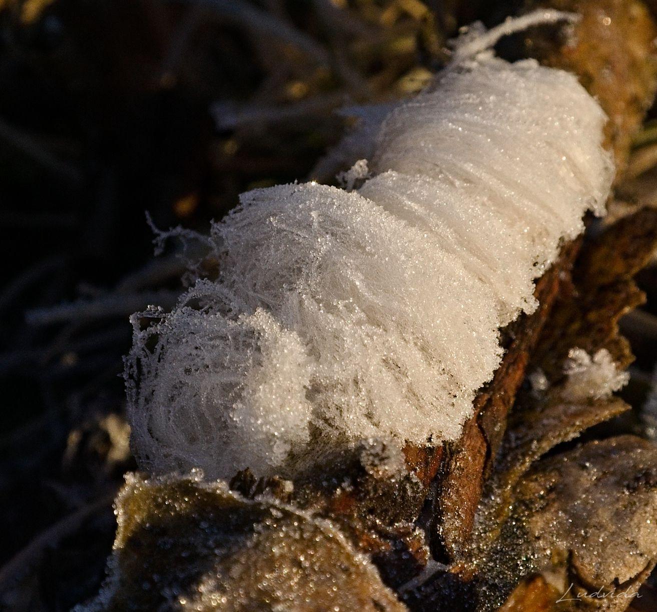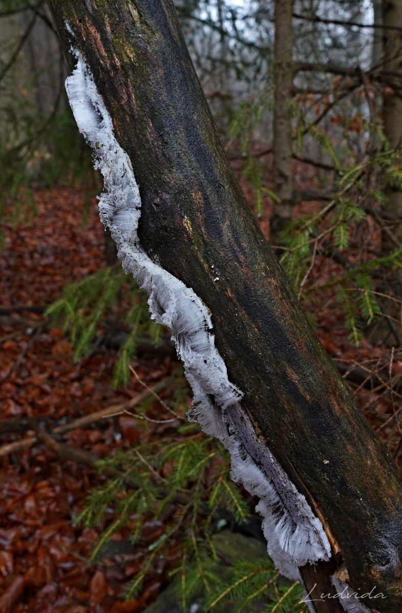 Děje se to tak. Když venku mírně mrzne a ve dřevě je ještě voda, začne se vytlačovat kapilárními otvory cca 0,1 mm na povrch, kde okamžitě mrzne. Pokud by ve dřevě nebyla na správná houba, voda by vytekla a spojila se, ale nějaká látka z ní způsobí, že se jednotlivá ledová vlákna nespojí a “rostou” třeba až do délky několika centimetrů. Tyto vlasy v lese září svojí bělostí, a tak je snadné si jich všimnout. Prostě veliká krása, která byla popsána až v roce 2015.